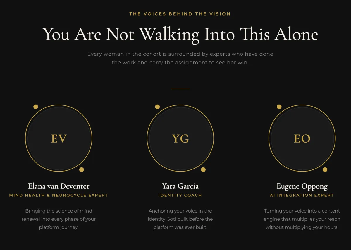 Throughout the cohort we bring in voices who carry deep expertise in the specific areas that shape a woman's platform from the inside out. These are not guest lectures. They are divine appointments. Each expert arrives at exactly the moment in your journey where their wisdom lands with the most weight. Because God never builds anything alone and neither do we.